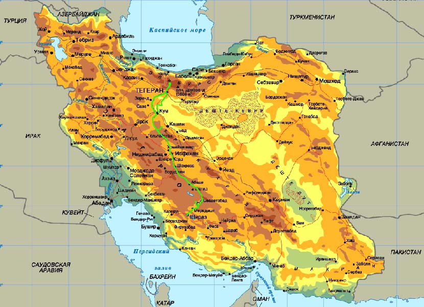 вулкан Демавенд (5610 м). Официальное название страны - Исламская Республика Иран. Глава государства - Высший руководитель, который является религиозным лидером и назначается Советом экспертов, состоящим из представителей исламского духовенства. В настоящее время - Высший Руководитель и Глава Ирана - аятолла Али Хаменеи, а не Президент, как вы могли бы подумать, Друзья мои! Со всех многочисленных плакатов и портретов, по всей стране на денно и нощно вас будут строго смотреть два почтенных старца - ныне покойный аятолла Хомейни и ныне здравствующий аятолла Хаменеи. Исполнительная власть сосредоточена в руках Президента и Совета министров. Президент является вторым после Высшего руководителя государственным лицом. Он представляет страну на официальном уровне и избирается прямым всенародным голосованием на четырёхлетний срок. Около 50% населения Ирана - персы. Второй по численности народ страны - азербайджанцы (37%). Также в стране проживают курды - (6%), туркмены - (3%) , арабы - (2%), белуджи - (2%). Официальный язык Ирана - персидский, или, как его называют местные жители, фарси. Он принадлежит к иранской группе индоевропейской семьи языков. Иран - единственное исламское государство, где господствует шиизм. Около 90% верующего населения страны - мусульмане-шииты. 8% верующих - мусульмане-сунниты, а оставшиеся 2% приходится на зороастрийцев. На карте слева ярким зеленым цветом показан наш маршрут по Ирану, поездка разделилась на две части - покататься на сноуборде в горах Эльбурс, под седым взором вулкана Демавенд, и проехать по наиболее интересным городам Персии - Исфахану, Ширазу, Персеполю, Куму. По возможности, далеко не отдаляясь от маршрута, посмотреть не только исторические достопримечательности, но и природные - Соленое Озеро, Пещеры, Водопады! Поездка заняла 10 дней, в первой декаде марта 2009 года! |
