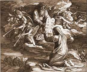 И изрёк Бог [к Моисею] все слова сии, говоря: Я Господь, Бог твой, Который вывел тебя из земли Египетской, из дома рабства; да не будет у тебя других богов пред лицом Моим. Не делай себе кумира и никакого изображения того, что на небе вверху, и что на земле внизу, и что в воде ниже земли; не поклоняйся им и не служи им, ибо Я Господь, Бог твой. Почитай отца твоего и мать твою, [чтобы тебе было хорошо и] чтобы продлились дни твои на земле, которую Господь, Бог твой, даёт тебе. Не убивай. Не прелюбодействуй. Не кради. Не произноси ложного свидетельства на ближнего твоего. Не желай дома ближнего твоего; не желай жены ближнего твоего, [ни поля его,] ни раба его, ни рабыни его, ни вола его, ни осла его, [ни всякого скота его,] ничего, что у ближнего твоего. Весь народ видел громы и пламя, и звук трубный, и гору дымящуюся; и увидев то, [весь] народ отступил и стал вдали. И когда [Бог] перестал говорить с Моисеем на горе Синае, дал ему две скрижали откровения, скрижали каменные, на которых написано было перстом Божиим. Исход 20:1-18; 31:18 |