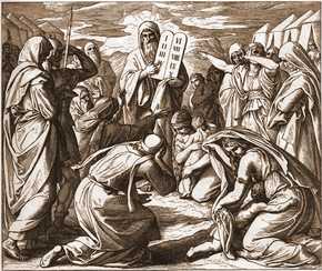 Cпустившись с горы, потея под тяжестью каменных скрижалей, увидел Моисей, что нерадивые его соплеменники танцуют бесовские танцы около Золотого Тельца. Разозлился он такой вакханалии, и решил на практике применить одну из свежеиспеченных заповедей - НЕ УБИВАЙ! и призвал верных слуг своих, и приказал всех убить.... " и пало в