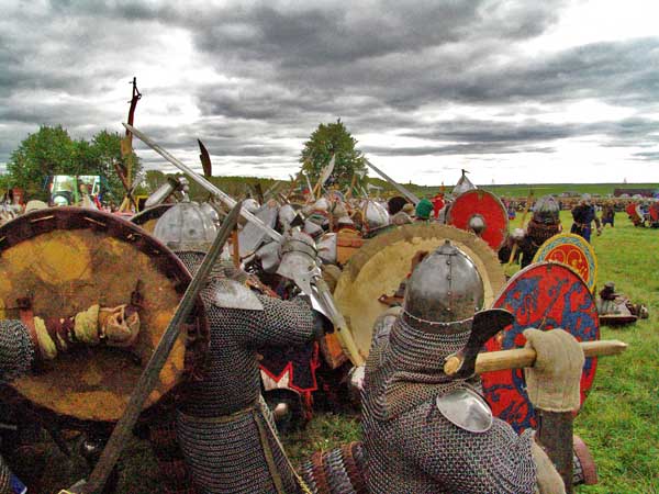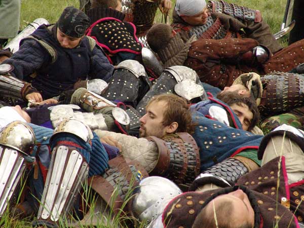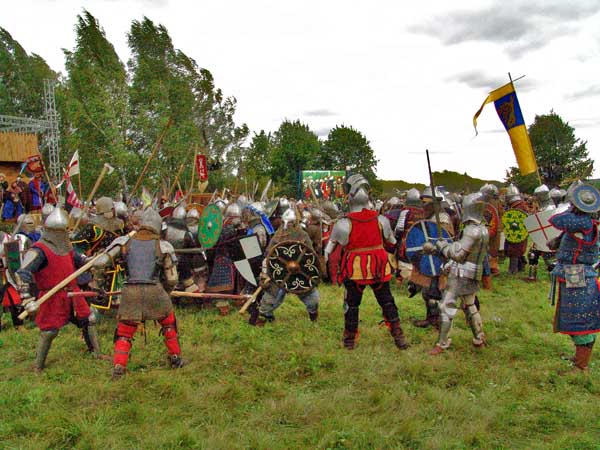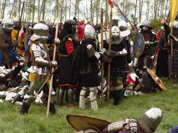 Звон железа, крики... ржанье лошадей... выстрелы орудий... средневековых... тяжелому рыцарю уже трудно подняться... поле покрывается раненными...
