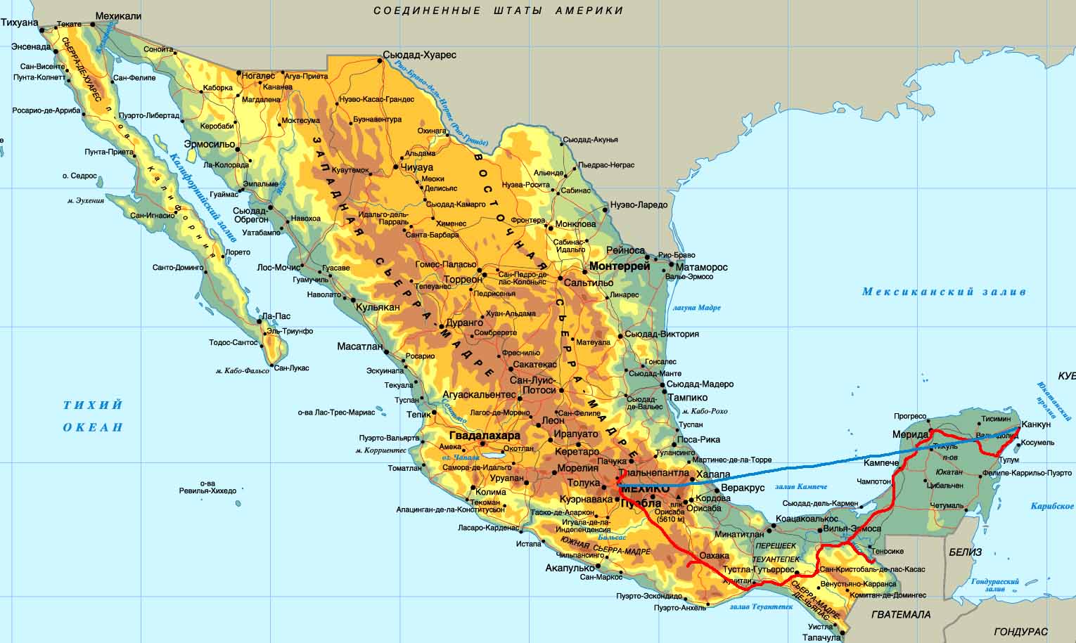 | Наше путешествие пролегало по незамысловатому маршруту, включающему основные достопримечательности центральной и южной части Мексики. Это, если так можно выразиться - разведка боем, попытки вместить в 2-3 недели как можно больше, не вдаваясь в детали.. не вживаясь в быт местных индейцев. это поверхностный взгляд заинтересованного и умного странника, который хочет понять стоит ли вернуться.. и куда. Итак, прибытие в Мехико, пару дней на осмотр столицы и поездка в Теотиуакан, затем - переезд в Оахаку (Ночной автобус ADO) Окрестности этого интересного города, включая Монте Альбан. Переезд в Сан Кристобаль. Посещение каньона Сумидеро. Переезд в Паленке. Посещение водопадов. Поездка к границе с Гватемалой - два древних заброшенных города - Яхчилан и Бонапак. и, конечно, самого древнего города Паленке. Переезд в Мариду, столицу штата. Посещение древнего города Ушмаль. Переезд в Чичен Ицу и ее посещение . Переезд в Тулум. Пару дней на море, посещение древнего города Тулум и поездка по сенотам - обводненным карстовым пещерам. переезд в Канкун. Пляжные лежки. Поездка в Плайя-де-Кармен. Перелет в Мехико, несколько часов в городе и... возвращение :) |